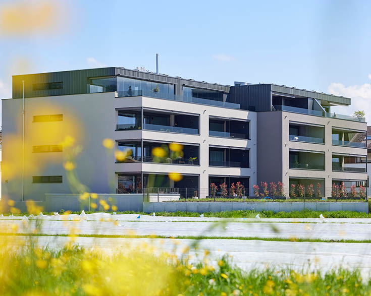 Auf dem Flachdach der beiden Gebäude ist eine grosse PV-Anlage montiert, die einen grossen Teil des notwendigen Stroms liefert. Die erwartete Jahresleistung beträgt 60'000 kWh(p). «Wärmepumpen und Photovoltaik sind eine optimale Kombination», meint Bauherr Hanspeter Köppel. Eine vergleichbare, wenn auch kleinere Anlage hat er vor einigen Jahren von der Gebrüder Lüchinger AG auf einem Einfamilienhaus installieren lassen: «Das System funktioniert einwandfrei und hat mich überzeugt, auch bei diesem Objekt auf eine solche Anlage zu setzen.»