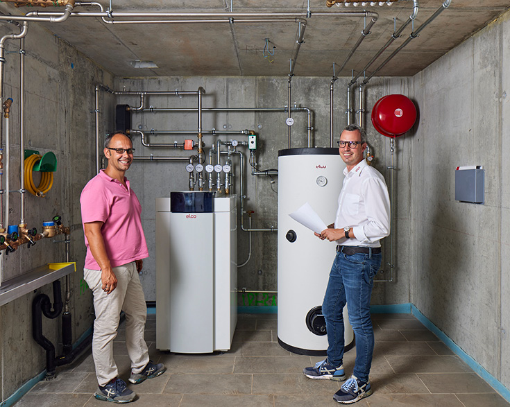 So auch bei der Residenza Vignoo in Mendrisio TI. An der Stelle eines früheren Rebberges («Vignoo» im Tessiner Dialekt) ist hier eine Terrassensiedlung mit 12 Eigentumswohnungen entstanden. Jede davon verfügt über eine eigene Erdsonde und eine eigene Heizzentrale, damit die Eigentümerinnen und Eigentümer grösstmögliche Autonomie geniessen. «Als Wärmeerzeuger nutzen wir die Sole-Wasser-Wärmepumpe ELCO AQUATOP® S. Diese speist einerseits den Warmwasserspeicher, andererseits über einen kleinen Wärmetauscher die Bodenheizung der jeweiligen Wohnung», erläutert Roberto Piazza, Geschäftsführer der Teknoimpianti SA (Morbio Inferiore). Lediglich in einer der zwölf Zentralen ist ein zusätzlicher Pufferspeicher montiert – denn hier muss neben der Bodenheizung auch ein kleiner Pool mit Wärme versorgt werden