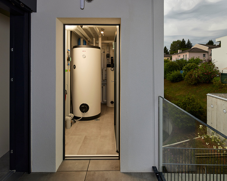 Ein weiteres «Zückerli» der Heizungsanlage ist die Kühlfunktion. «Gerade in heissen und schwülen Sommern ist es sehr angenehm, die Innentemperatur nicht allzu stark ansteigen zu lassen. Deshalb haben wir zwei Kühlkreisläufe eingebaut», sagt Mauro Zocchetti. Die Planung und Umsetzung der gesamten Installationen für Heizung, Kühlung und Sanitäranlagen übernahm die Galli SA Impianti Sanitari (Lamone TI). Projektleiter Simone Speroni erläutert das zweistufige Kühlkonzept wie folgt: «Jedes Split-Aussengerät ist mit einem Innengerät in der entsprechenden Wohnung verbunden. Mit einem Verteiler können wir einerseits die Bodenheizung ansteuern und sie zum Heizen oder für die passive Kühlung nutzen. Ein zweiter Kühlkreis führt von der Inneneinheit zu Gebläsekonvektoren. Mit diesen Geräten bringen wir zusätzlich kühle Luft in die Wohnräume.» Im Gegensatz zu einer klassischen Klimaanlage arbeitet diese doppelte Kühlung sehr effizient. «Wenn die Sonne scheint, produziert sie auch gleich PV-Strom, der von der Wärmepumpe genutzt wird. Je stärker die Sonne scheint und je höher der Kühlbedarf ist, desto mehr Strom wird erzeugt. Aus energetischer Sicht ist das natürlich optimal», sagt Speroni. Die grösste Herausforderung beim Projekt sei nicht die Installation an sich, sondern der vorhandene Raum gewesen: «Die vier Technikräume sind wirklich sehr knapp bemessen, um keine Wohnfläche zu verschwenden. In jedem Raum sind neben der Inneneinheit der Wärmepumpe, dem Verteiler und diversen Pumpen auch ein Warmwasserspeicher sowie ein kleiner Pufferspeicher für die Wärmepumpe untergebracht.