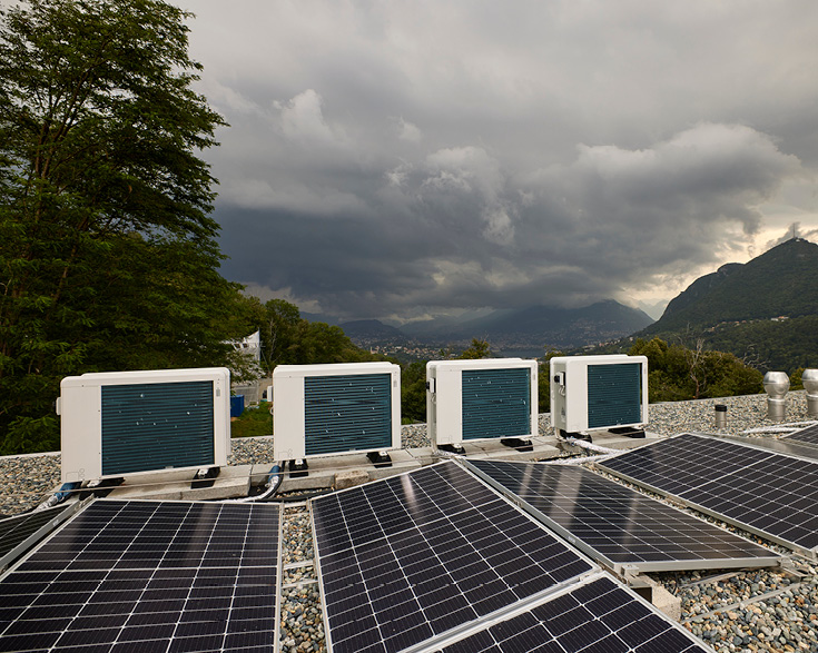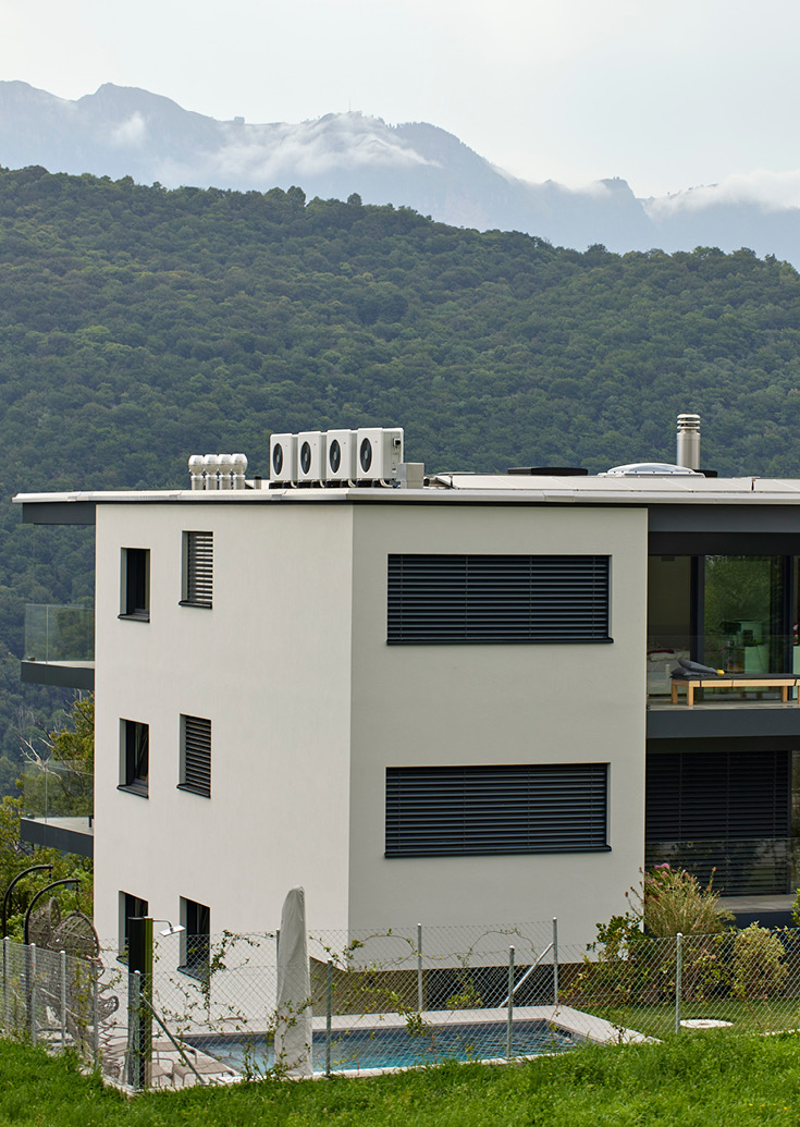 Während viele Neubauten in Beige- oder Grautönen gehalten sind, sticht «Q4» mit seiner schneeweissen Fassade regelrecht heraus. Der helle Farbton reflektiert das Sonnenlicht und vermindert damit das Aufheizen der Fassaden. «Hier im Tessin merken wir den Klimawandel deutlich. Deshalb habe ich grossen Wert auf die energetische Effizienz gelegt», erläutert Zocchetti. Der Neubau ist nach der GEAK-Gebäudeeffizienzklasse A zertifiziert. Gemäss dem kommunalen Baureglement konnte damit die Hauptnutzfläche um fünf Prozent höher ausfallen. Mit Dämmstärken von 24 Zentimetern auf den Fassaden und satten 30 Zentimetern auf dem Dach wird sowohl der sommerliche Hitzeschutz wie auch ein möglichst niedriger Heizwärmebezug im Winter gesichert. Das gebäudetechnische Bijou ist auf dem Dach installiert. Hier befindet sich eine PV-Anlage mit einer Leistung von 15 kW(p). Mit dem Solarstrom werden vier «Aerotop Split»-Wärmepumpen von ELCO betrieben. Jede Eigentumswohnung besitzt also ihren eigenen Wärmeerzeuger. Weshalb verzichtet das Projekt auf einen zentralen Heizraum? «Aufgrund der Wünsche unserer Kunden weiss ich, dass diese Unabhängigkeit sehr geschätzt wird», erläutert Mauro Zocchetti, «denn ansonsten gibt es ständig Diskussionen nach dem Muster: Ich will doch nicht mehr für die Heizung bezahlen müssen, nur weil du immer die Fenster offen lässt.» Zwar sei die Investition etwas höher als bei einer gemeinsamen Heizung, doch auf dem Markt werde die Autonomie sehr geschätzt und sei ein gutes Verkaufsargument.