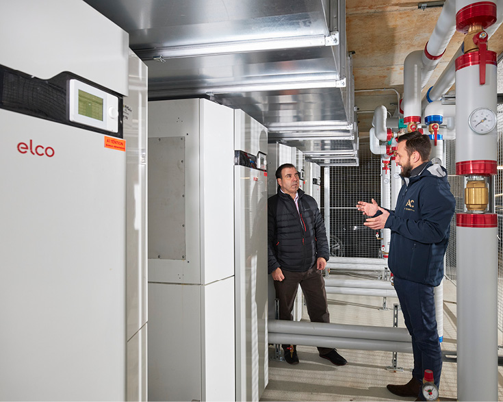 Auch Installateur Mawin Langel ist glücklich über die neue Referenzanlage: «Unsere bisherige Bestmarke war eine Kaskade mit zwei Wärmepumpen. Nun haben wir eine ViererKaskade umsetzen können, die gut funktioniert.» Wichtig für den Erfolg des Projektes sei neben der engen und vertrauensvollen Zusammenarbeit mit ELCO auch die Koordination mit den Architekten gewesen: «Die Maschinen benötigen einen guten, geräumigen Ort, damit der Zugang für die Wartung gewährleistet ist. Damit die Schallschutzvorgaben eingehalten werden können, braucht es zudem eine sorgfältige Planung. Das ist hier gelungen.» Und Bauherr Daniel Gonzalez fügt an: «Meine Familie und ich sind glücklich und stolz, dass wir den Anstoss für den Bau eines so schönen Gebäudes geben konnten. Die moderne Heiztechnik ist das i-Tüpfelchen.»