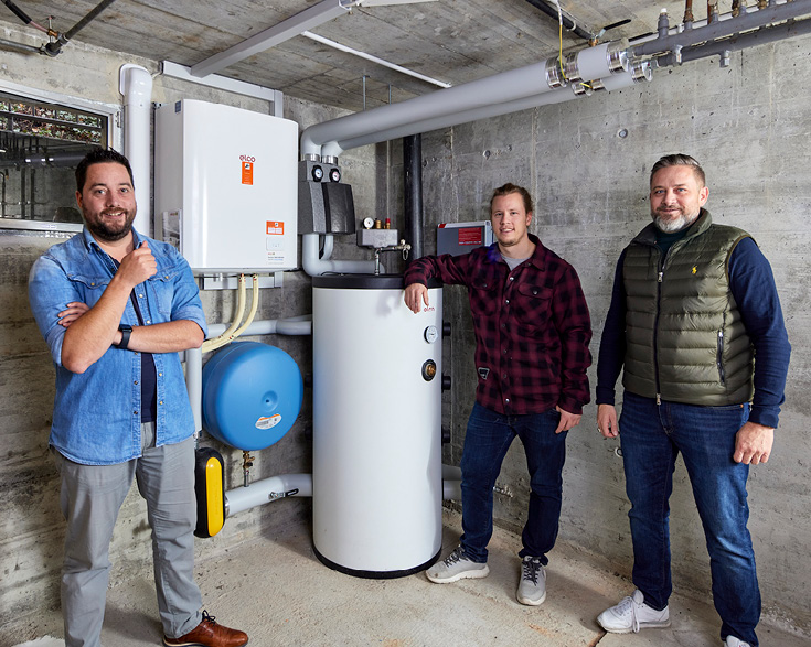 «Wir installieren dieses Modell sehr oft. Das Preis-/Leistungsverhältnis der AEROTOP® SPLIT ist optimal, und die Anlage spart im Gebäude viel Platz ein. Das ist meistens massgebend beim Entscheid für eine solche Split-Maschine», sagt Fabian Boss, zuständiger Projektleiter bei der Adolf Krebs AG. Im Heizraum, der früher von der Elektroheizung dominiert wurde, sind nur noch die Inneneinheit der Wärmepumpe und ein 200-Liter-Pufferspeicher zu sehen. Die Inneneinheit enthält sämtliche Pumpen und Ventile, was die Installation nochmals kompakter und schneller macht.