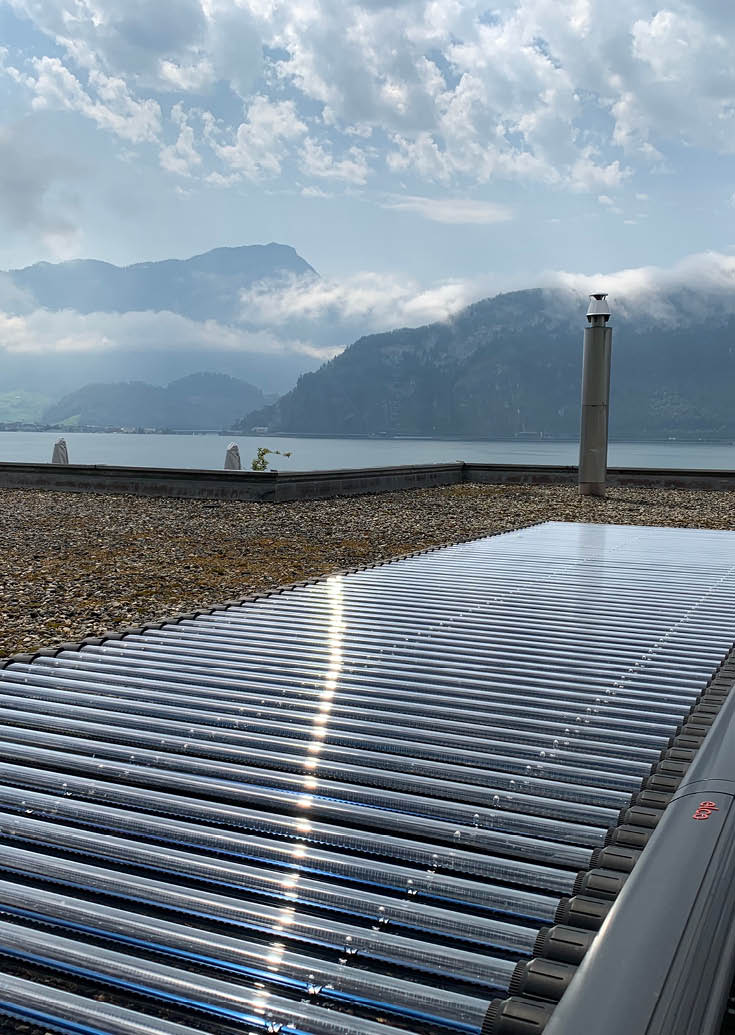 Die Solarthermie ist seit den 1980er Jahren etabliert. Das Prinzip ist einfach: Spezielle Kollektoren übertragen die Wärme der Sonnenstrahlung auf ein Gemisch aus Wasser und Glykol (Frostschutzmittel). Das von der Sonne erwärmte Gemisch wird mit einer Leitung zum Heizraum geführt, wo es für die Warmwasseraufbereitung, die Heizungsunterstützung oder beides genutzt werden kann. Dank der Vorerwärmung des Warmwassers muss die Heizung weniger Leistung aufwenden oder kann im Sommer ganz ausgeschaltet werden. Auch die Heizungsunterstützung während der Übergangszeit und im Winter ist ein Gewinn. Die Effizienz einer Solarthermie-Anlage hängt von der Grösse des Gebäudes und dessen Nutzung ab: Je mehr Personen das Gebäude nutzen, desto rentabler ist die Solarthermieanlage.
