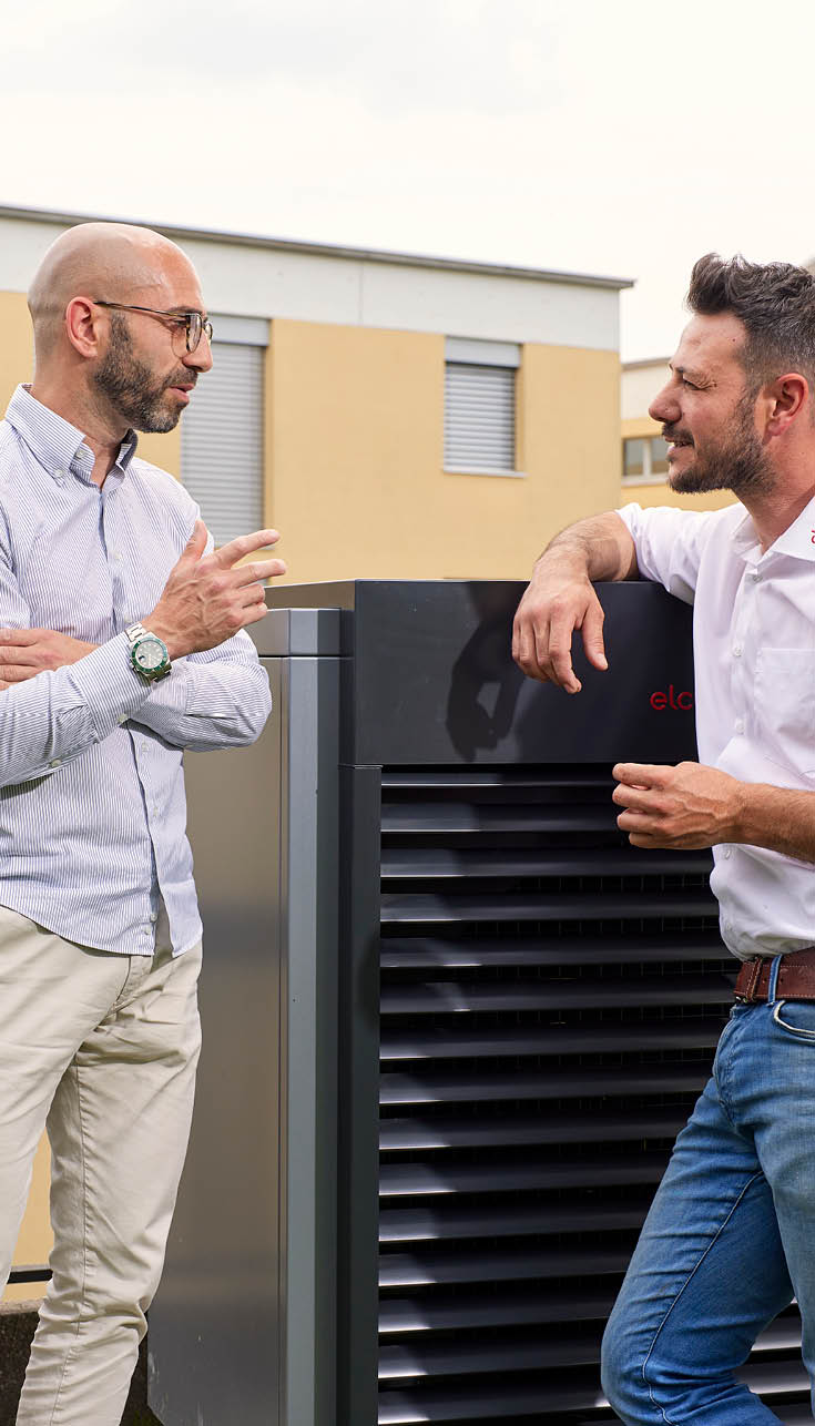 Für die bestehende Wärmeverteilung mit Radiatoren wurde von der Bauherrschaft keine Sanierung geplant. Die hohen Vorlauftemperaturen mussten deshalb weiterhin erreicht werden. Die Leistung der alten Heizung lag bei über 30 Kilowatt. Doch damit war die Anlage deutlich überdimensioniert. «Zu diesem Gebäude gab es nur wenig alte Pläne und Unterlagen. Gemeinsam mit Elco konnten wir den effektiven Wärmebedarf berechnen, welcher sich auf 20 Kilowatt beläuft», berichtet Roberto Maida. Im Prinzip könnte diese Heizleistung auch von einer einzigen Wärmepumpe erreicht werden. Elco-Verkaufsberater Pietro Prestigiacomo riet jedoch zu einer Wärmepumpen-Kaskade AEROTOP® SX 20. Sie besteht aus zwei AEROTOP® SX 10, die zu einem schlagkräftigen Team verbunden werden.