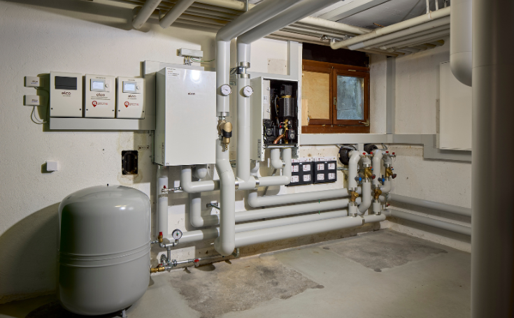 Die zwei neuen ELCO Wärmepumpen übernehmen die gesamte Heizwärmeversorgung sowie die Warmwasseraufbereitung für das grössere Haus übernehmen. Die Solarthermie-Anlage des kleineren Hauses funktioniert noch einwandfrei und bleibt in Betrieb. Die gesamten Arbeiten wurden in gut zwei Wochen erledigt. Nach dem Rückbau der alten Anlage wurden Fundamente für die neuen Maschinen betoniert und die Verbindungsleitungen zum Technikraum gezogen. Die Bodenheizung konnte problemlos über die bestehenden Heizgruppen angeschlossen werden.