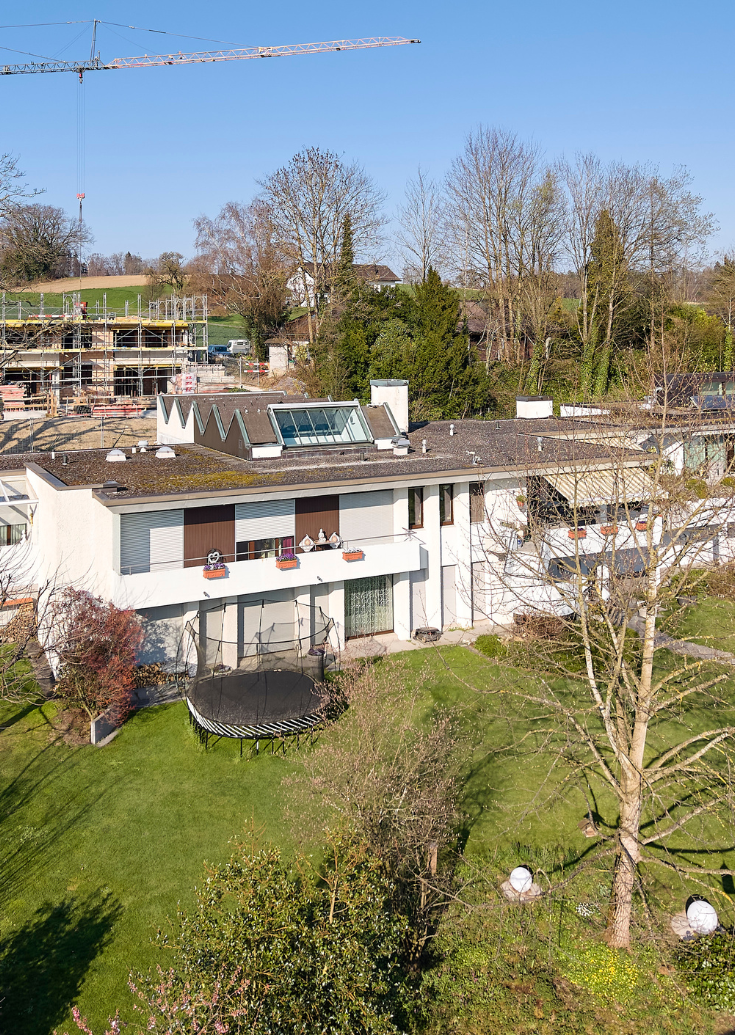 Die zwei Häuser von Bruno Trutmann haben schon einige verschiedene Heizsysteme erlebt. Gab es zunächst eine Ölheizung, entschied sich der Bauherr 1975 für eine innovative bivalente Anlage. Thermische Solarkollektoren sowie ein zusätzliches Erdregister sollten Umweltwärme ernten, welche in einem 7’000 Liter fassenden Tank gespeichert wurden. Weil die Anlage leider nicht zufriedenstellend funktionierte, wurde 1995 abermals eine Ölheizung eingebaut. 2008 ersetzte man diese mit zwei aussen aufgestellten Luft/Wasser-Wärmepumpen für die Raumwärme. Das Warmwasser sollte von zwei neuen thermischen Solaranlagen aufbereitet werden.