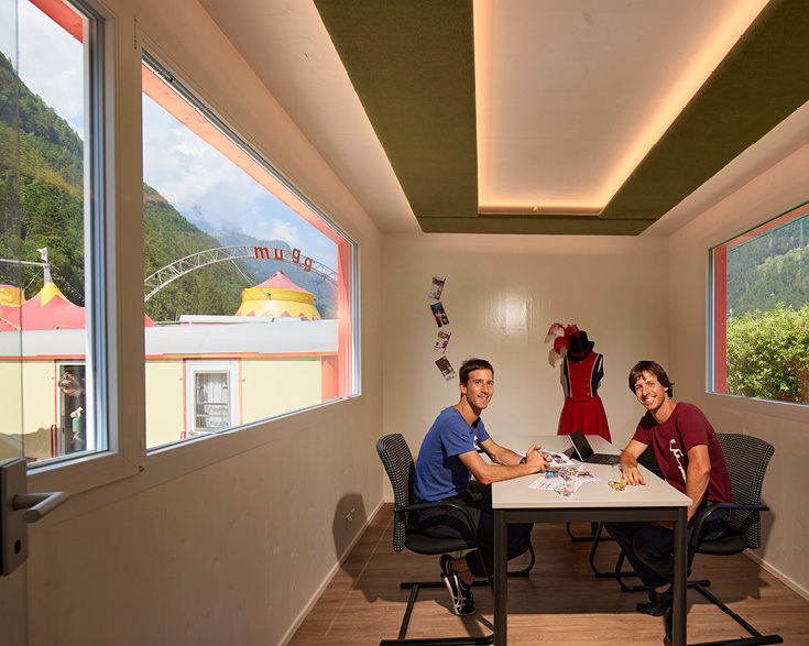 La partie supérieure de la roulotte a été entièrement démantelée et remplacée par une nouvelle construction en éléments de bois, permettant une répartition généreuse de l’espace. La structure très compacte du plancher a été préservée : les méandres du chauffage de sol sont intégrés dans des panneaux thermiques d’une épaisseur de 30 millimètres. « C’est du solide », explique Ischa Muggli, qui se saisit alors d’un coffre rempli de massues de jonglage et s’éclipse. L’entraînement n’attend pas. Ce soir, en effet : tous en piste et chapeau bas au cirque Mugg !