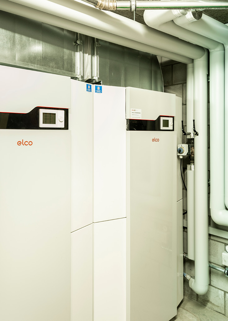 «Une reproduction de l’ancienne installation aurait été beaucoup trop complexe. Il était donc clair pour nous qu'il fallait trouver une solution nouvelle et meilleure», déclare l’installateur Jürg Grossenbacher, propriétaire de la société Grossenbacher Haustechnik GmbH. Pour remplacer l'ancienne pompe à chaleur, il a installé deux nouvelles pompes à chaleur de type Elco Aerotop S15M-IH d’une puissance de 17 kilowatts chacune. «Ce groupe est modulant, ce qui signifie qu'il adapte son fonctionnement à la puissance demandée et à la température extérieure du moment. C’est beaucoup plus efficace qu'une grande pompe à chaleur qui fonctionne en permanence à 100 % de sa puissance», explique J. Grossenbacher. Le système est conçu de manière à ce qu'une seule pompe à chaleur à la fois soit en service. Lorsque les besoins en chauffage ou en eau chaude augmentent, la deuxième se met automatiquement en marche. Cela permet de toujours fournir uniquement la puissance réellement nécessaire. Un circuit veille à ce que les deux pompes à chaleur fonctionnent en alternance. Elles sont ainsi soumises à une charge uniforme. Les deux ballons d’eau chaude de 1000 litres installés dans la buanderie n'avaient été que partiellement endommagés par les inondations. Après avoir retiré l'ancienne isolation, les ballons ont pu être nettoyés et équipés d'une nouvelle isolation. Ils servent désormais de ballons de stockage pour le chauffage. En revanche, l’eau potable n'est plus stockée dans des ballons, mais elle traitée «à la demande» par deux postes de production d’eau chaude Elco de type 40-2. Ils transmettent la chaleur des grands ballons de chauffage à l’eau froide au moyen d'échangeurs de chaleur à plaques. Ce procédé est plus efficace sur le plan énergétique que la production directe d'eau chaude via une pompe à chaleur. Chaque poste peut fournir entre 3,5 et 39 litres d'eau chaude par minute. «L’idée des postes de production d’eau chaude nous est venue pendant la phase de planification. Il ne nous semblait tout simplement pas logique de disposer de la capacité totale pour un seul résident à la fois», rapporte Jürg Grossenbacher