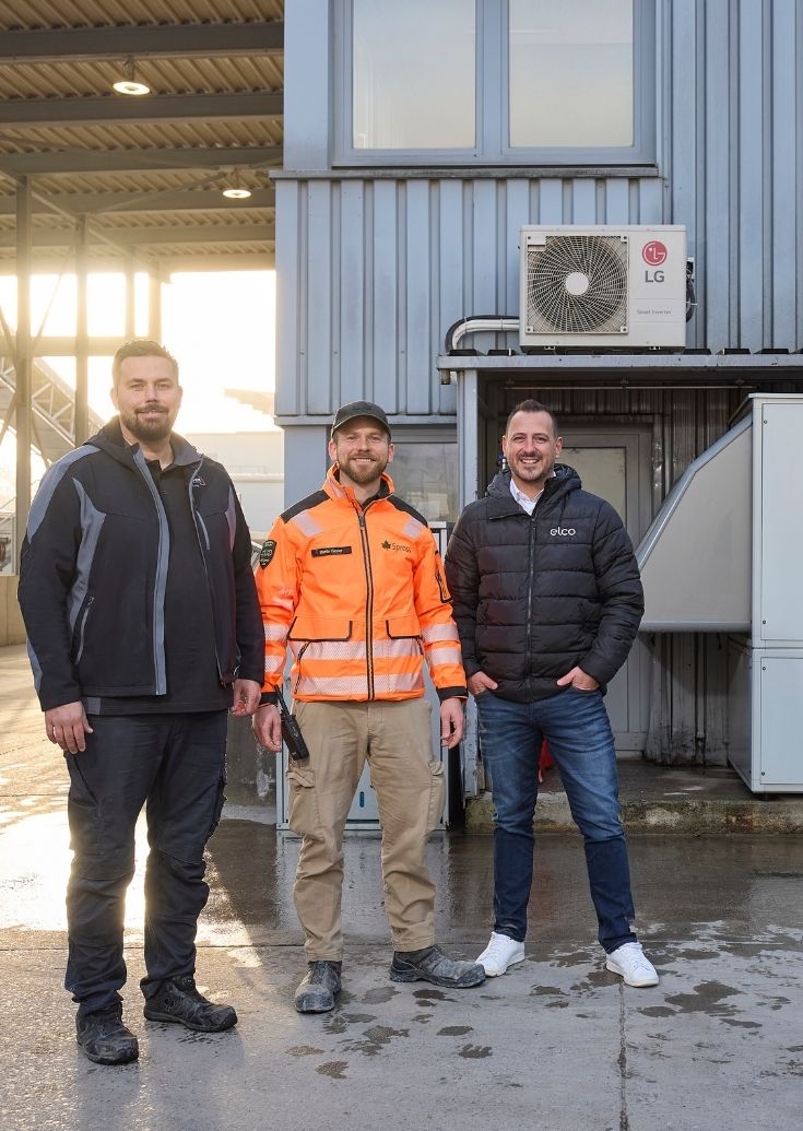 La version initiale du système de chauffage a été mise en service dès 2023. À l'époque, on l'alimentait «seulement» avec la chaleur résiduelle de deux petits broyeurs. La chaleur résiduelle est ici récupérée à l'aide de deux échangeurs de chaleur à plaques, installés au-dessus des moteurs électriques de manière à être protégés de la poussière. Les deux petits broyeurs et le grand broyeur neuf dégagent beaucoup de chaleur. Une pompe à chaleur ELCO AEROTOP® T 35R est également utilisée en complément et pour pallier les besoins pendant les jours fériés, les week-ends ou les journées particulièrement froides. Elle utilise l'air extérieur pour produire davantage de chaleur et la transférer également vers les accumulateurs. La production d'eau chaude est assurée par une station d'eau propre ELCO 40.3. Elle tire sa chaleur de l’accumulateur tampon et peut fournir jusqu'à 70 litres par minute.