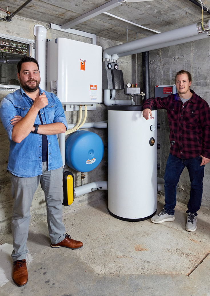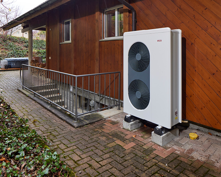 Per i Baumann, il nuovo sistema di riscaldamento doveva essere a termopompa. Dai primi chiarimenti è emerso che una soluzione a sonda geotermica non era favorevole per motivi geologici. I coniugi hanno perciò optato per una termopompa aria-acqua AEROTOP® SPLIT di ELCO. L'unità esterna è stata installata sul retro della casa. Ben riparato dal bordo del tetto, l'apparecchio aspira l'aria esterna dal lato posteriore e la espelle frontalmente attraverso due ventilatori in direzione del pendio limitrofo. In questo modo né le proprie finestre, né le case dei vicini sono interessate dalle emissioni di rumore. In cantina si trovano l'unità interna della termopompa e un accumulatore tampone da 200 litri.