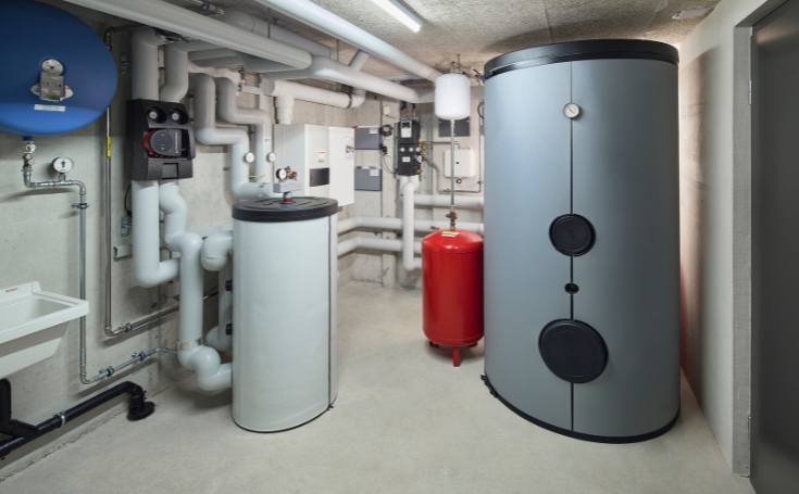 Caldaia a gas ELCO THISION® S (35 kW, «strozzata» a 25 kW) per il calore ambiente. Impianto solare termico a supporto della produzione dell'acqua calda. Accumulatore per acqua calda da 1500 litri.