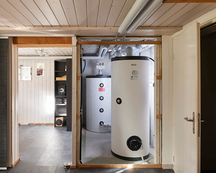 Grazie a questi diversi interventi di risanamento, il comfort abitativo è costantemente aumentato. Solo il riscaldamento lasciava ancora a desiderare. Al posto delle stufe a legna, le cui tracce sono ancora visibili nella lavanderia, più di 30 anni fa i precedenti proprietari fecero installare un riscaldamento elettrico. L'imponente impianto di un intenso colore arancione si trovava in un ripostiglio nel piano interrato e alimentava i radiatori a battiscopa del piano superiore tramite una rete di condotte idroniche. intenso colore arancione si trovava in un ripostiglio nel piano interrato e alimentava i radiatori a battiscopa del piano superiore tramite una rete di condotte idroniche.