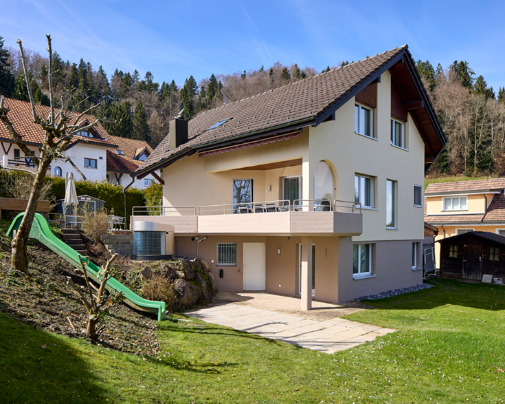 La casa indipendente della famiglia Schläpfer è stata costruita nel 1985. Situato ai piedi del Ramsenstock a ovest di Herisau, l'edificio ha già vissuto diversi risanamenti parziali. «Abbiamo sostituito tutte le finestre, rinnovato completamente la cucina e il bagno, annesso un nuovo garage e sostituito i pavimenti in tutti i locali», elenca il committente Alexander Schläpfer. L'ultima pendenza era la sostituzione del riscaldamento. La caldaia a gas esistente ha dovuto essere riparata due volte a causa di una perdita nello scambiatore. Alla terza riparazione, gli Schläpfer ne avevano abbastanza. Insieme all'installatore del riscaldamento, hanno perciò cercato una nuova soluzione, possibilmente sostenibile.