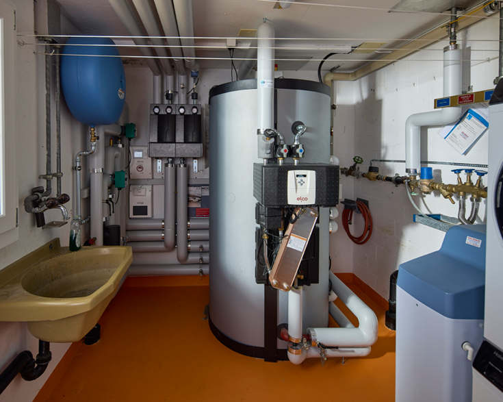 Il nuovo generatore di calore è stato collegato al sistema di distribuzione esistente con due gruppi di riscaldamento. Uno per i sistemi a pavimento ai piani superiori, l'altro per i radiatori nel piano interrato, entrambi alimentati con temperature di mandata ottimali. Per la produzione dell'acqua calda si è optato per un'interessante soluzione. Tenuto conto degli spazi piuttosto ristretti nel locale tecnico, Heinz Frischknecht ha consigliato di installare un solo grande accumulatore a stratificazione da 800 litri, che funge al tempo stesso da fonte di energia per il calore ambiente e l'acqua calda. Quest'ultima è prodotta con un modulo per acqua calda sanitaria 40.3 di ELCO.