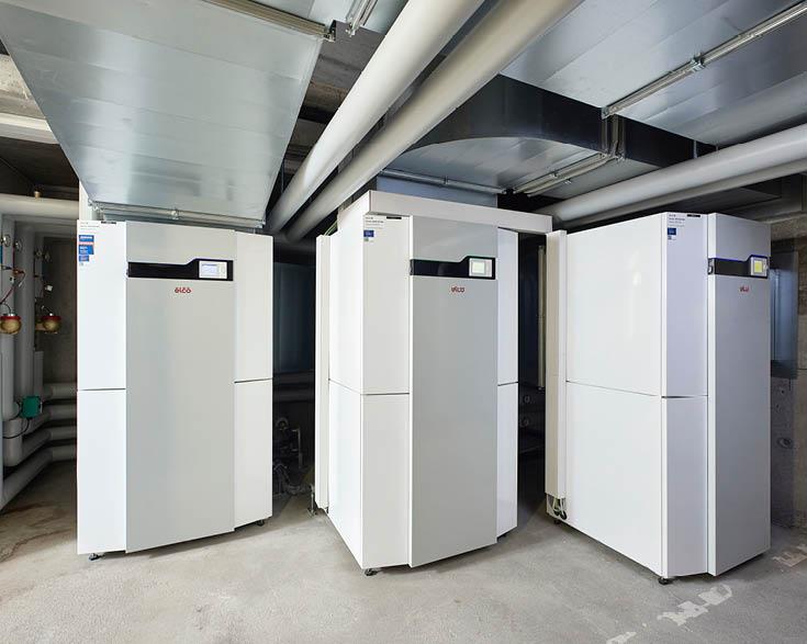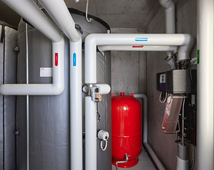 Tenuto conto che l'edificio era già stato costruito con un sistema termico a pavimento, occorrono solo basse temperature di mandata. Le tre termopompe alimentano un accumulatore per il riscaldamento da 2'ooo litri e tutte le unità abitative fanno capo a un solo circuito. Un altro accumulatore da 2'ooo litri serve al modulo centralizzato per acqua calda sanitaria. Secondo Thomas Ruppen, questa soluzione comporta diversi vantaggi: «L'acqua calda può essere prodotta quando è effettivamente richiesta e non deve essere stoccata, il che è ottimale in termini di igiene. E l'efficienza delle termopompe è molto alta, visto che non devono raggiungere temperature elevate per la produzione di acqua calda.»