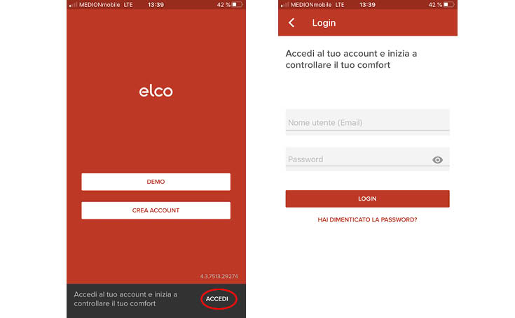 Aprite la app REMOCON NET sul vostro smartphone ed eseguite il login con i vostri dat